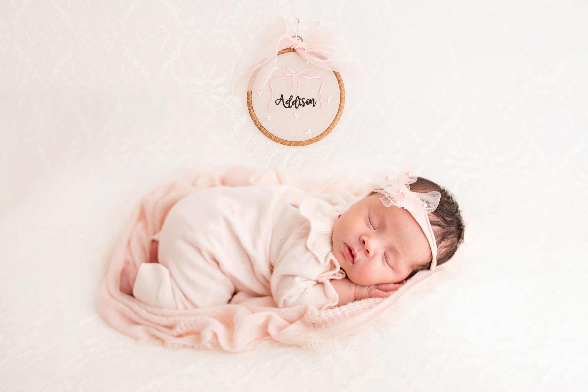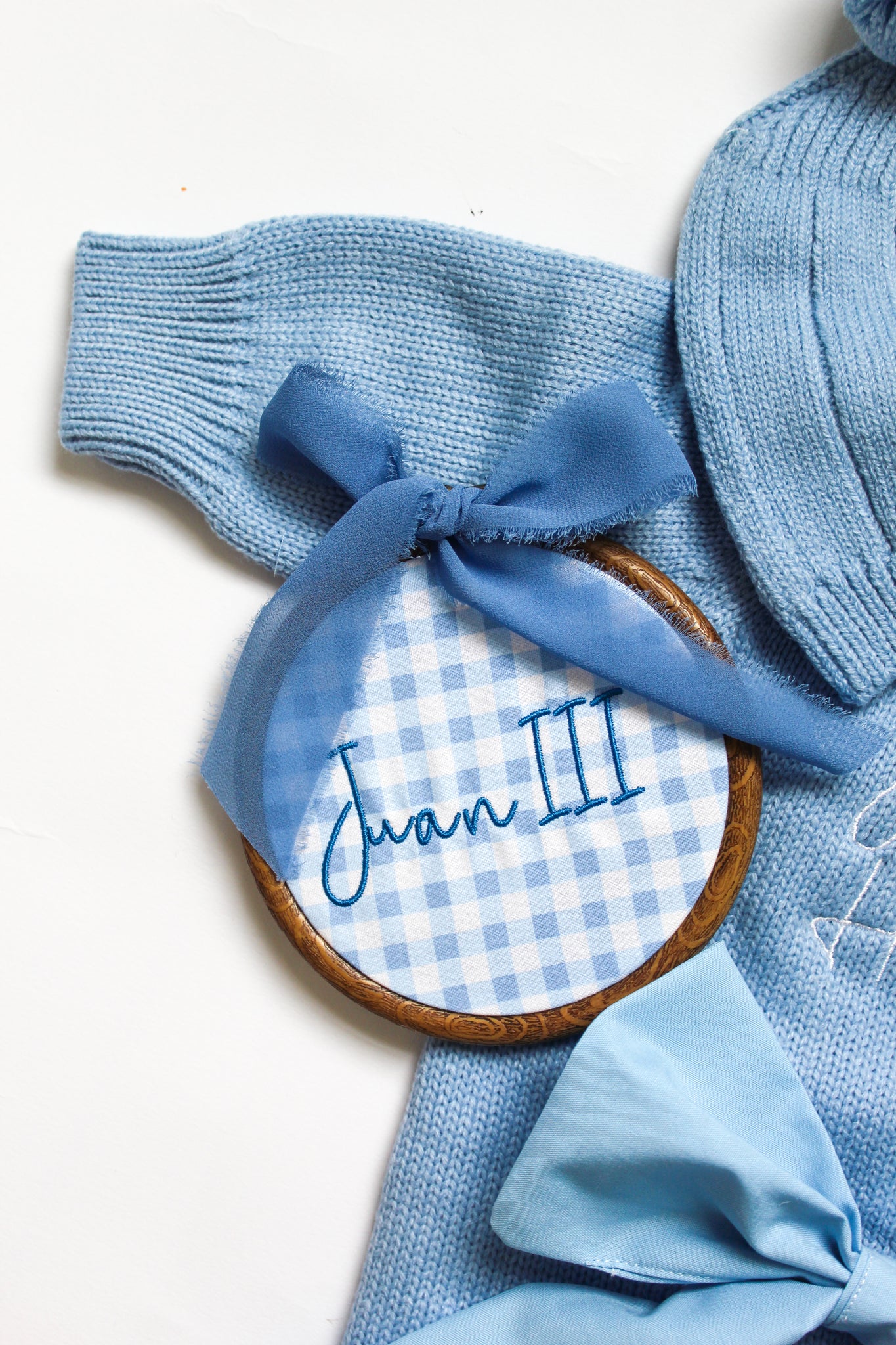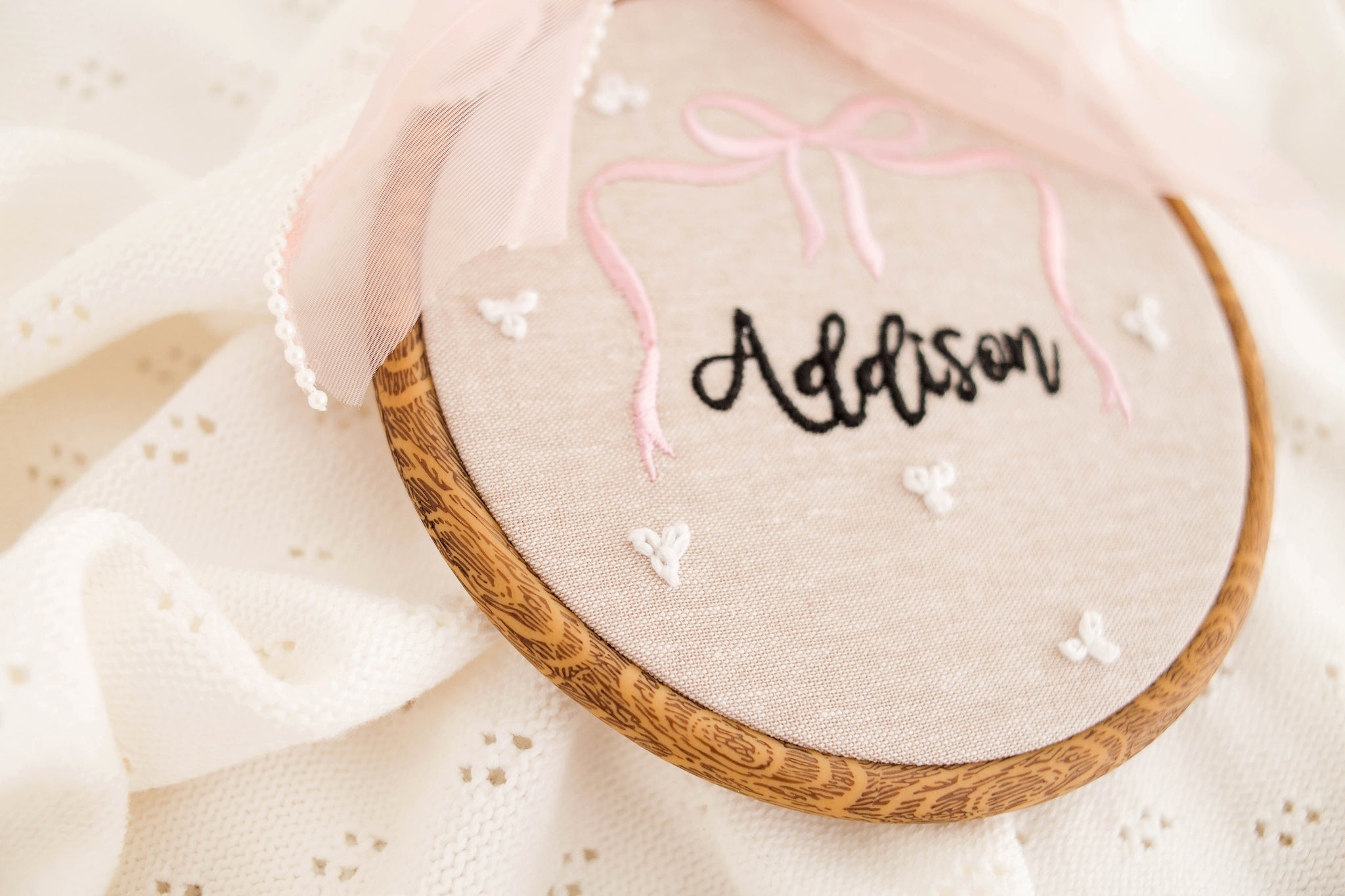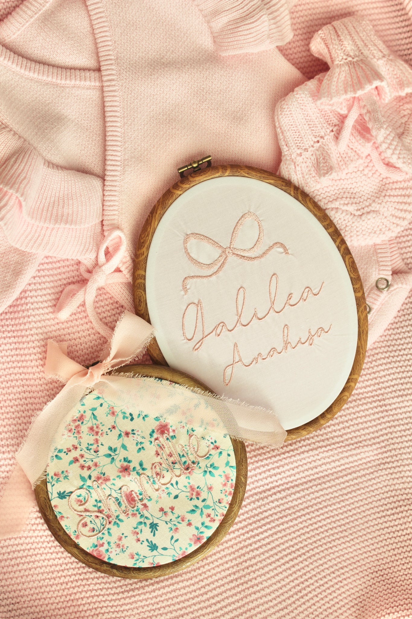 A keepsake to treasure! Choose from a variety of shapes, sizes, fabric for background and color for thread: