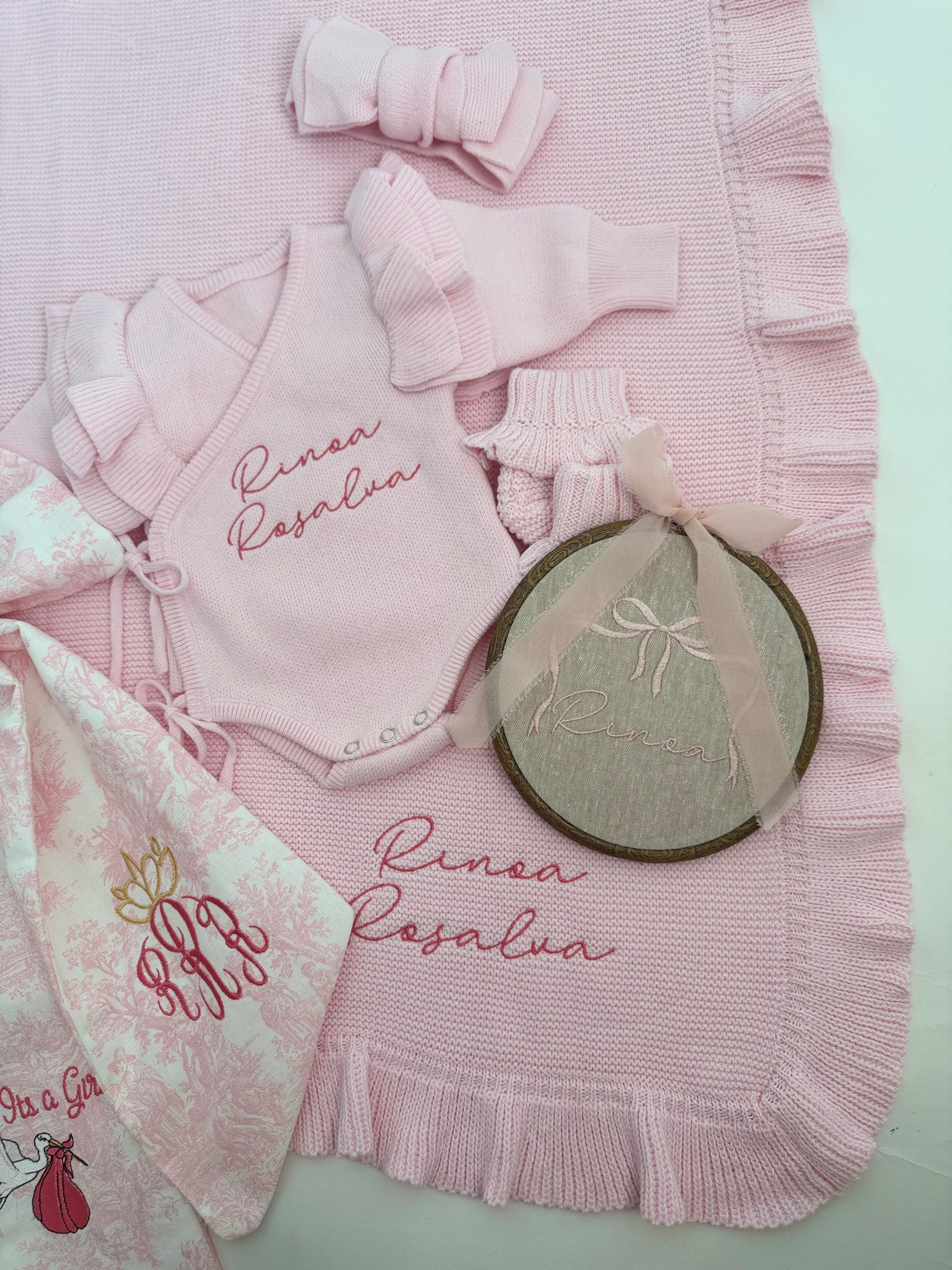 Bring your new little babe home in our cozy pink set! Available in a set of romper, booties and headband set only in newborn size. Matching blanket is optional. Please review your notes as to write correct spelling, and specify color for thread (white, light pink or dark pink) on the personalization box.
