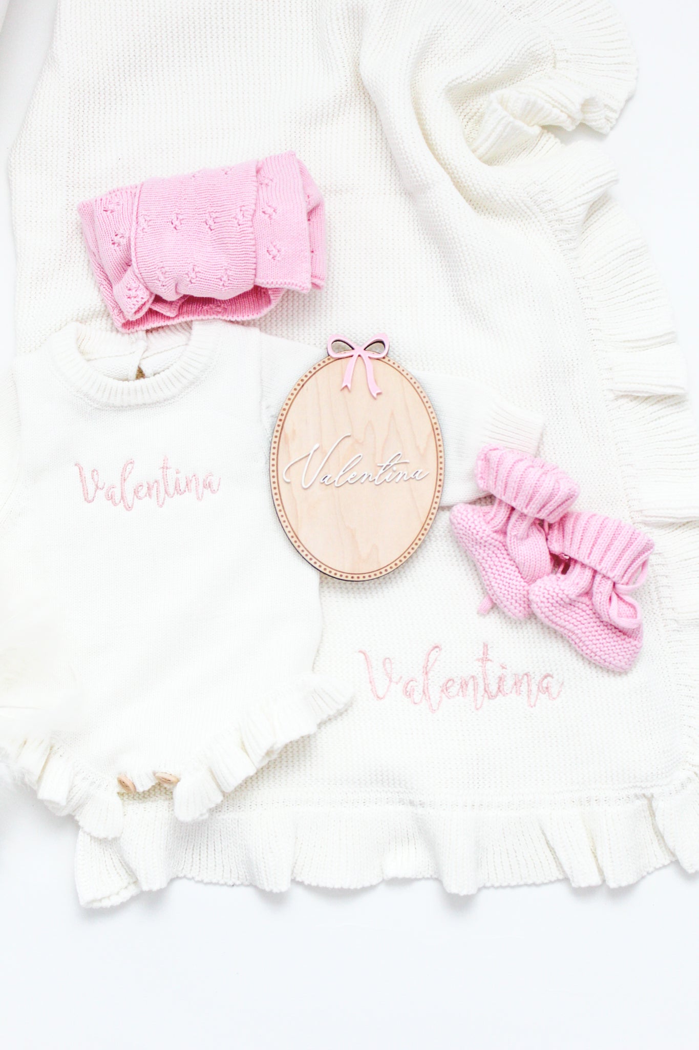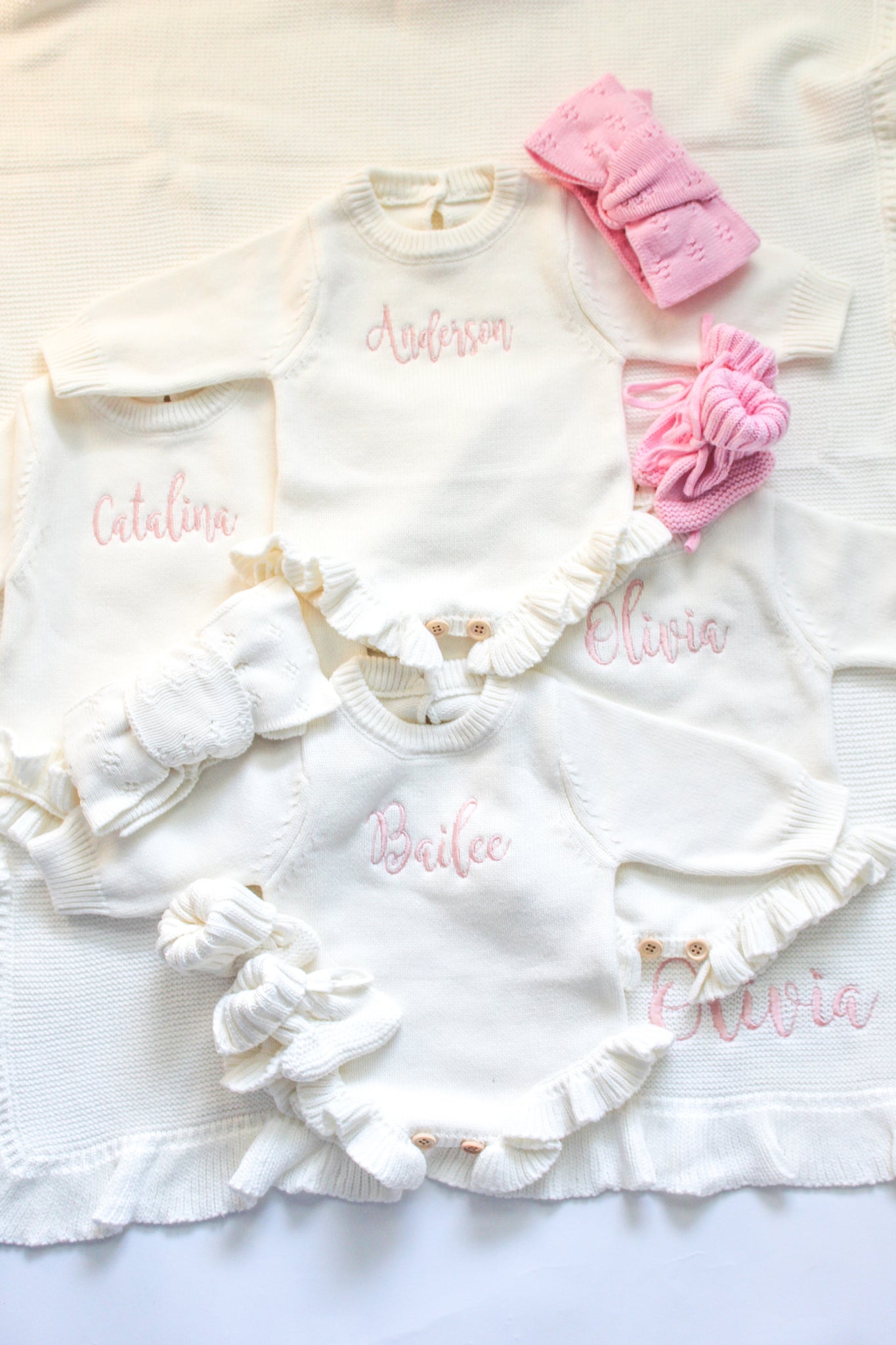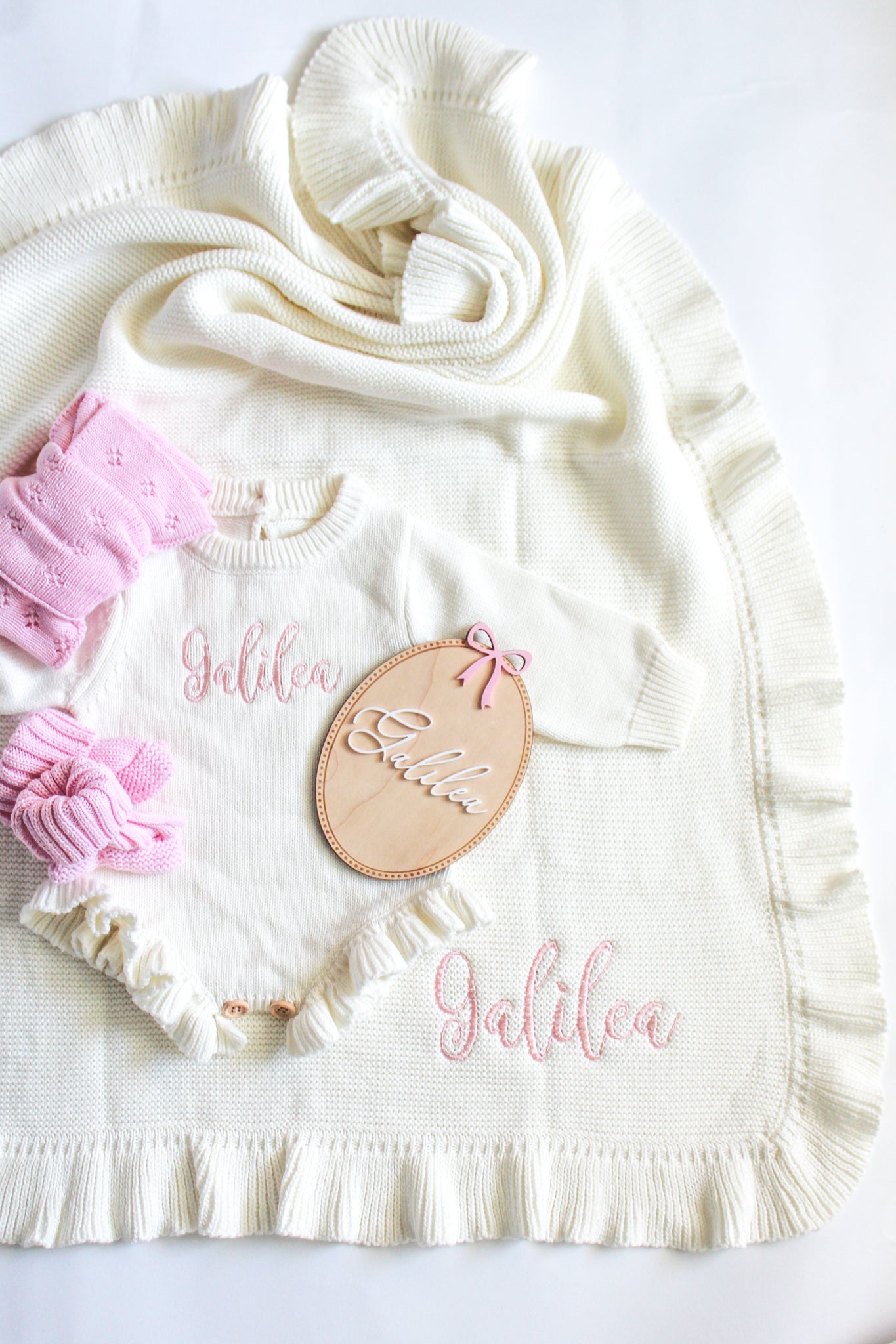 The perfect coming home outfit for your little babe! Your choice of personalized name in the front of romper, choose the color of thread you'd like and style (Alia or Eliana font). The receiving blanket is an add on, and it the same style as the romper with the ruffles. The sweetest keepsake stitched to perfection. Please leave a note with name and what style of font as well color for thread.